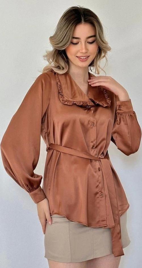 Kahverengi Yakası Fırfırlı Kuşaklı Saten Gömlek