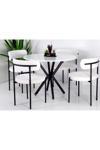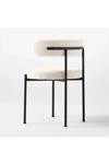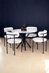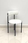 Siyah renkli ayak ve beyaz renkli kumaşın uyum içerisinde olduğu sandalyeler, modern görünümü destekler.