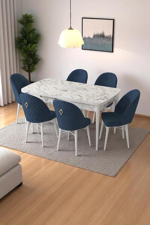 Kaktüs Avm Mia Serisi Açılabilir Mutfak Masası Takımı Beyaz Mermer Desen Masa 6 Sandalye, Yemek Masası