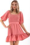 Yakası hem carmen yaka, omuzlar açık kullanılabilir, hemde kare yaka olarak kollar yukarı çekilerek kullanılabilir. Yakanın lastikli yapısı iki kullanıma da rahatlıkla olanak sağlamaktadır.
