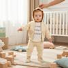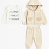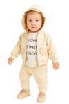 Baskılı uzun kollu tişört, kalp detaylı fermuarlı bej kapüşonlu üst ve yumuşak kumaştan esnek beliyle konfor sunan eşofman altından oluşur.