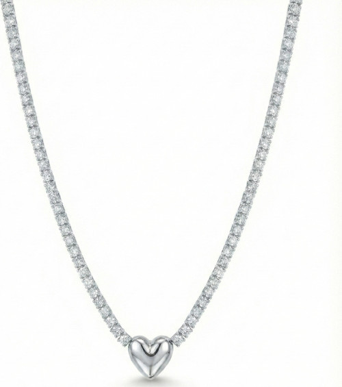 Zarafetin Kalbinde Bir Işıltı Boynunuzda ışıltılı bir nehir gibi akan bu Kalp Suyolu Gümüş Kolye, klasik tenis kolye şıklığını romantik bir kalp figürüyle buluşturuyor. Her bir halkasında özenle mıhlanmış yüksek kaliteli zirkon taşlar, ışığı her açıdan yansıtarak göz kamaştırıcı bir parlaklık sunar.