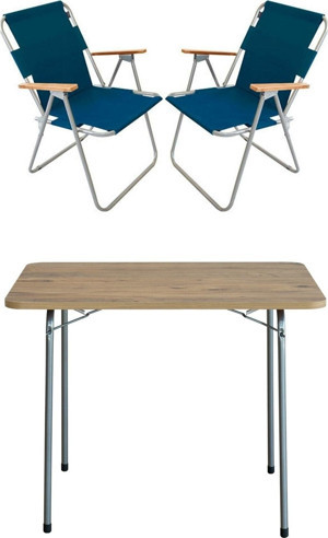 Bofigo 60x80 Çam Katlanır Masa + 2 Adet Katlanır Sandalye Kamp Seti Bahçe Balkon Takımı Mavi