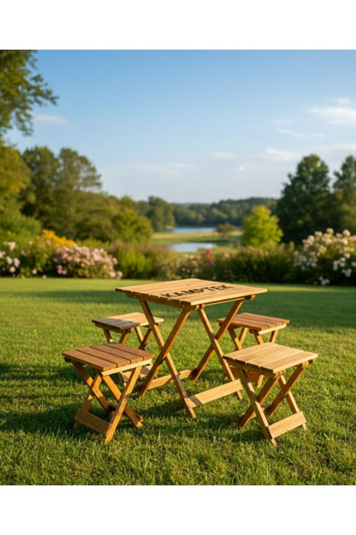 Tamamı doğal ahşaptan üretilen bu katlanabilir masa ve tabure seti, hem kamp maceralarınızda hem de bahçe keyfinizde size eşlik etmek için tasarlandı.