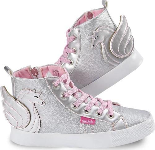 Kendinden dokulu mat gümüş gri, yüksek konçlu kız çocuk sneakers ayakkabı. Ayakkabının dış yanlarında unicorn aplikesi vardır. Kanatları 3 boyutludur. Bağcıklar simli pembedir. Suni deriden yapılmıştır. Nemli bez ile temizlenebilir.