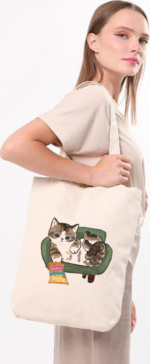 Kanvas Cips Yiyen Kedi Bez Çanta C1616