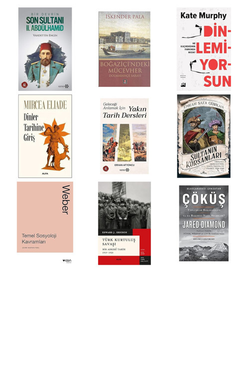 Bir Devrin Son Sultanı II.; Abdülhamid - Boğaziçi'ndeki Mücevher: Dolmabahçe Sarayı - Dinlemiyorsun: Ne Kaçırdığının Farkında Mısın? - Dinler Tarihine Giriş - Geleceği Anlamak İçin Yakın Tarih Dersleri - Sultanın Korsanları: Osmanlı Akdenizi'nde Gaza, Yağma ve Esaret, 1500-1700: Osmanlı Akdenizi'nde Gaza, Yağma ve Esaret, 1500-1700 - Temel Sosyoloji Kavramları - Türk Kurtuluş Savaşı: Bir Askeri Tarih 1919-1923 - Çöküş: Toplumlar Başarısızlığı ya da Başarıyı Nasıl Seçerler?