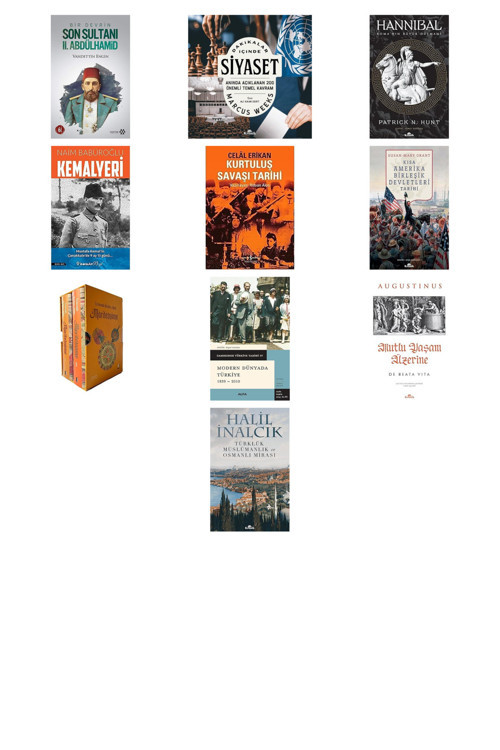 Bir Devrin Son Sultanı II.; Abdülhamid - Dakikalar İçinde Siyaset: Anında Açıklanan 200 Temel Kavram - Hannibal: Roma'nın Büyük Düşmanı: Roma'nın Büyük Düşmanı - Kemalyeri: Mustafa Kemal'in Çanakkale'de 9 Ay 13 Günü.; : Mustafa Kemal'in Çanakkale'de 9 Ay 13 Günü.; - Kurtuluş Savaşı Tarihi - Kısa Amerika Birleşik Devletleri Tarihi - Marifetname 1-2 (Ciltli - Kutulu Set) - Modern Dünyada Türkiye 1839 - 2010 (Ciltli): Cambridge Türkiye Tarihi 4 - Mutlu Yaşam Üzerine - De Beata Vita - Türklük Müslümanlık ve Osmanlı Mirası