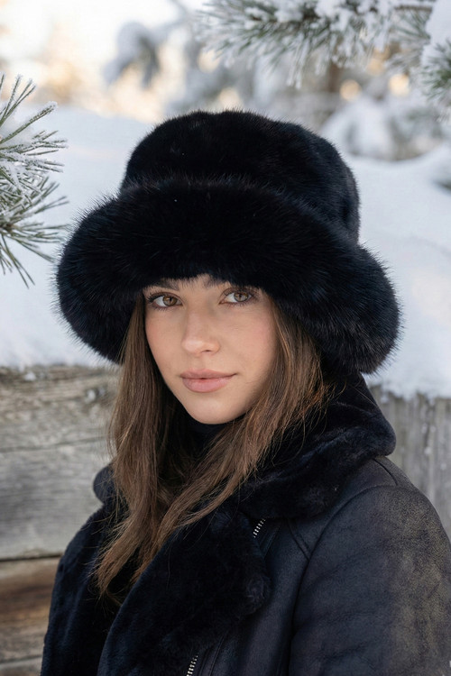 Kapin Siyah Kürk Tüylü Peluş Kalpak Şapka