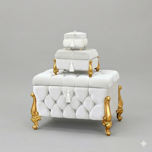 Çeyiz hazırlığının en zarif parçası olan Kapitoneli 3’lü Sandık Seti, şıklığı ve fonksiyonelliği bir arada sunuyor. Klasik kapitone işçiliği, ekru kadifenin asaleti ve altın rengi lükens ayak detaylarıyla nişan, söz ve düğün organizasyonlarınızda göz kamaştıracak bir sunum sağlar.
