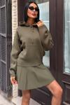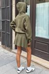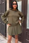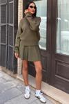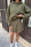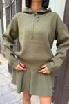 - Rahat kesimi ile günlük kullanım için ideal, kapüşonlu ve etekli triko takım.; - Kısa boy tasarımı sayesinde hareket özgürlüğü sunar ve şık bir görünüm sağlar.; - Türkiye'de üretilmiş olup yerel malzemelerle kaliteyi ön planda tutar.; - Yumuşak dokusuyla konforlu bir deneyim sunan triko kumaştan üretilmiştir.; - Kadın ve kız çocukları için uygun tasarım; her yaş grubuna hitap eder.; - Relaxed kalıp ile vücudu sarmayan rahat bir oturuş sağlar.; - Kolay bakım imkanı sunan yıkama talimatlarına sahiptir; pratik kullanım vaat eder.; - Doğal haki rengiyle doğal güzellikleri yansıtırken trend bir stil oluşturur.; - Trend ortamlarda dikkat çekici kombinler için idealdir; modaya uyum gösterir.; - Uzun kol tipi soğuk havalarda ekstra koruma sağlarken şıklığınızdan ödün vermezsiniz.; - Kapüşonlu yaka detayı hem stil sahibi görünmenizi sağlar hem de başınızı soğuktan korur.; - Sade düz deseniyle zamansız parçalar arasında yer alır; farklı aksesuarlarla kolayca kişiselleştirilebilir.; - Standart beden seçeneğiyle geniş kullanıcı kitlesine hitap eder; her vücut tipine uyum sağlar.; - Kaliteli triko materyali sayesinde uzun süreli kullanım vaad eder; dayanıklılığı arttırır.