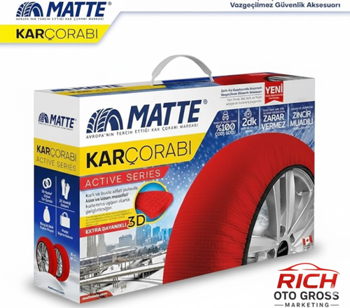Matte Active Series Kar Çorabı; karlı ve buzlu yol koşullarında aracınızın lastiklerine ekstra tutunma sağlayarak daha güvenli ve kontrollü bir sürüş deneyimi sunmak üzere geliştirilmiş yüksek performanslı lastik kar çorabıdır. Karlı/ buzlu zeminlerde lastik ile yol yüzeyi arasında maksimum sürtünme oluşturarak patinajı azaltır ve çekiş kabiliyetini artırır.