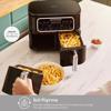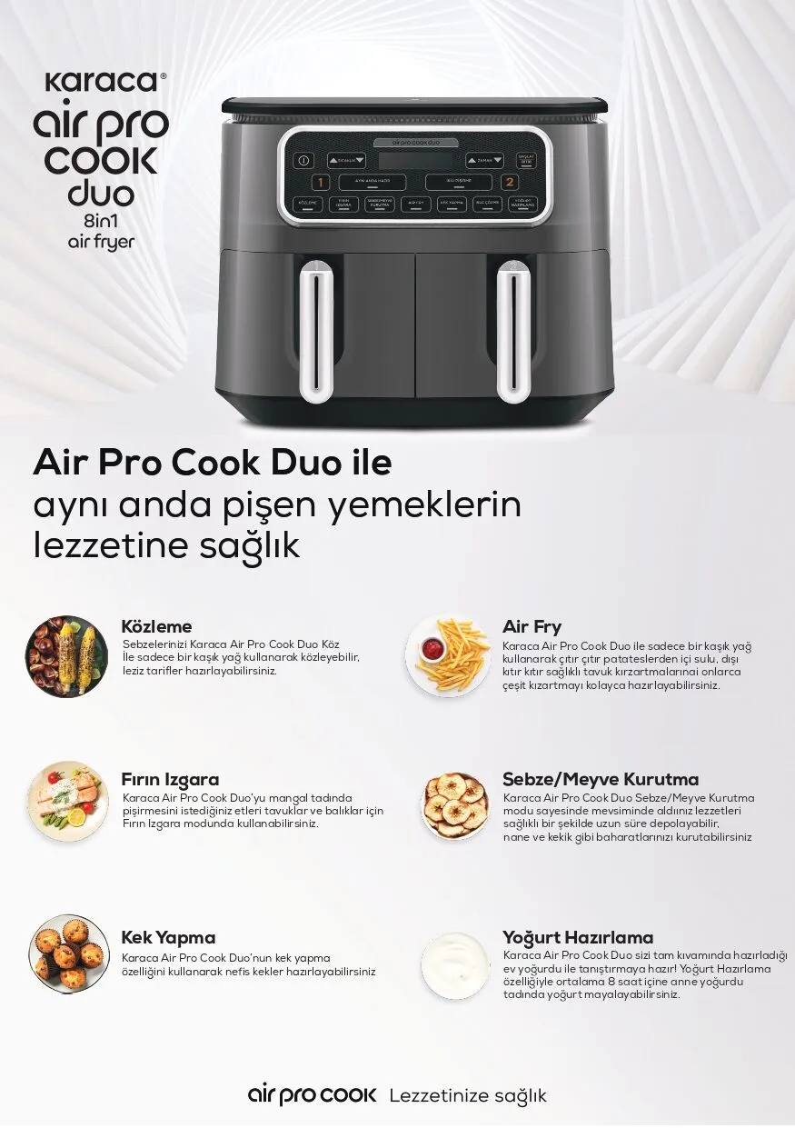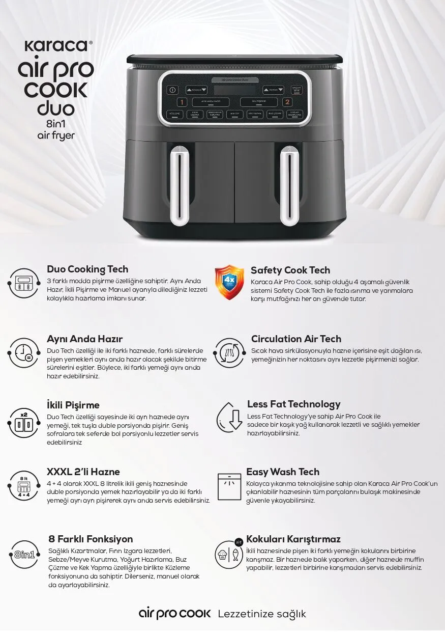 Karaca Air Pro Cook Duo; tüm lezzetleri Less Fat Technology ile sadece birer kaşık yağ kullanarak hazırlar. Circulation Air Tech ile yukarıdan aşağıya hareket eden sıcak hava akımıyla yemeklerinizin her noktası eşit pişer. Duo Tech özelliği sayesinde 3 farklı pişirme modunda dilediğiniz gibi yemeğinizi hazırlayabilirsiniz. İster Aynı Anda Hazır fonksiyonuyla iki farklı haznede, farklı sürelerde pişen yemekleri aynı anda hazır olacak şekilde servis edebilir, ister İkili Pişirme fonksiyonuyla XXXL 4+4 litre iki geniş haznede aynı yemeği, tek tuşla duble porsiyon yapabilirsiniz. İsterseniz tarifinize göre sıcaklık ve dakika ayarını manuel olarak da ayarlayabilirsiniz.