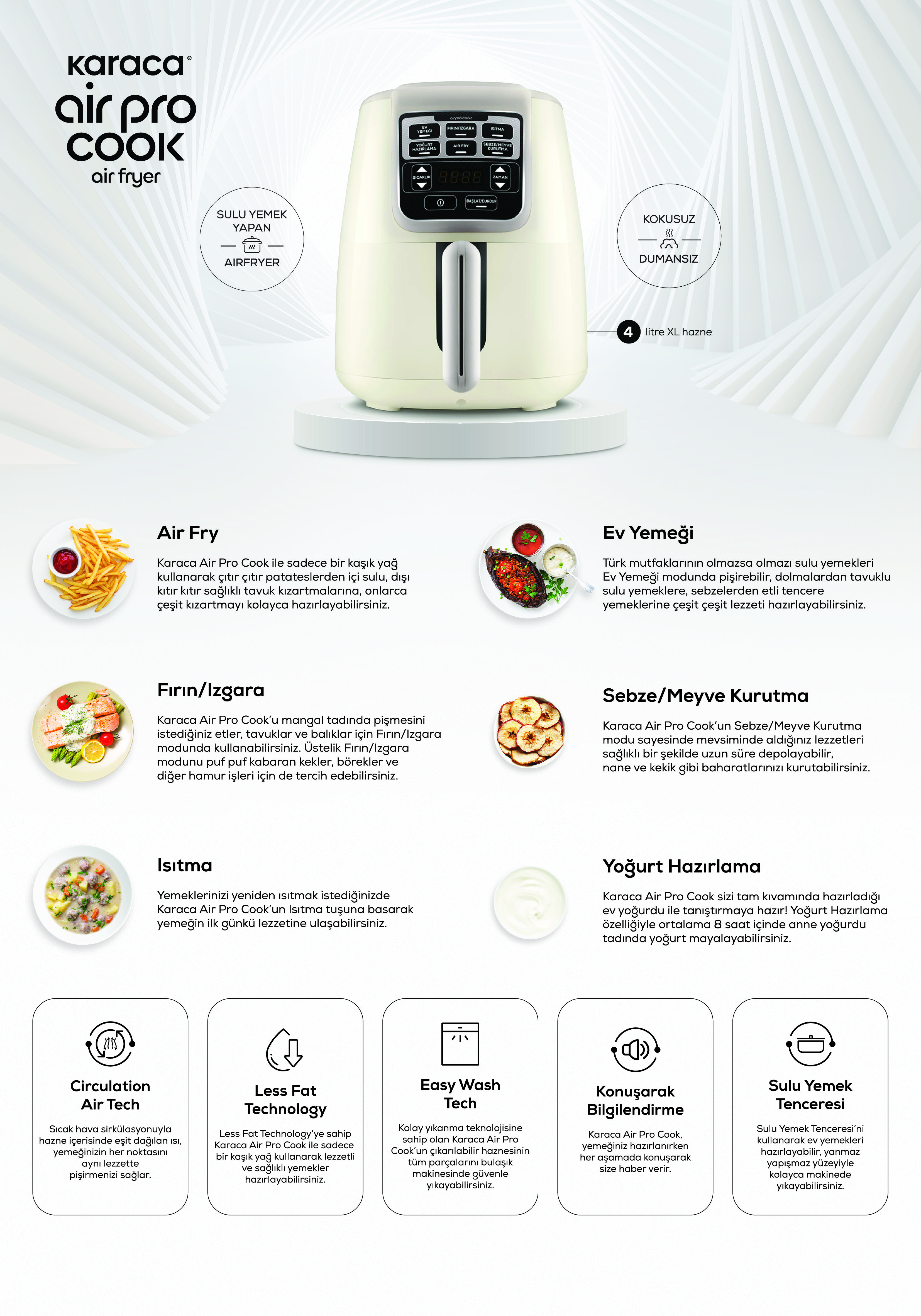 Hem lezzetli hem sağlıklı beslenmek isteyenlere, Air Pro Cook. Sağlıklı kızartmalar, ev yoğurdu, sebze-meyve kurutma, fırın ve ızgara lezzetlerinin yanı sıra sulu yemek de yapabilen Karaca Air Pro Cook, tüm lezzetleri Less Fat Technology ile sadece bir kaşık yağ kullanarak hazırlar.