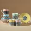 Karaca Bali Kahve Fincan Takımı gökkuşağının renklerini sunumlarınıza taşıyor. Kedigillerden ilham alınarak tasarlanan desenler, pastel tonları ile sunumlarınızın şıklığına şıklık katıyor. Karaca Bali 6 Kişilik Kahve Fincanı Takımı’nın içeriğinde bulunan 6 kişilik kahve fincanı ve kahve fincan tabağı ile misafirlerinize eksiksiz bir Türk kahvesi sunumu hazırlayabilirsiniz.