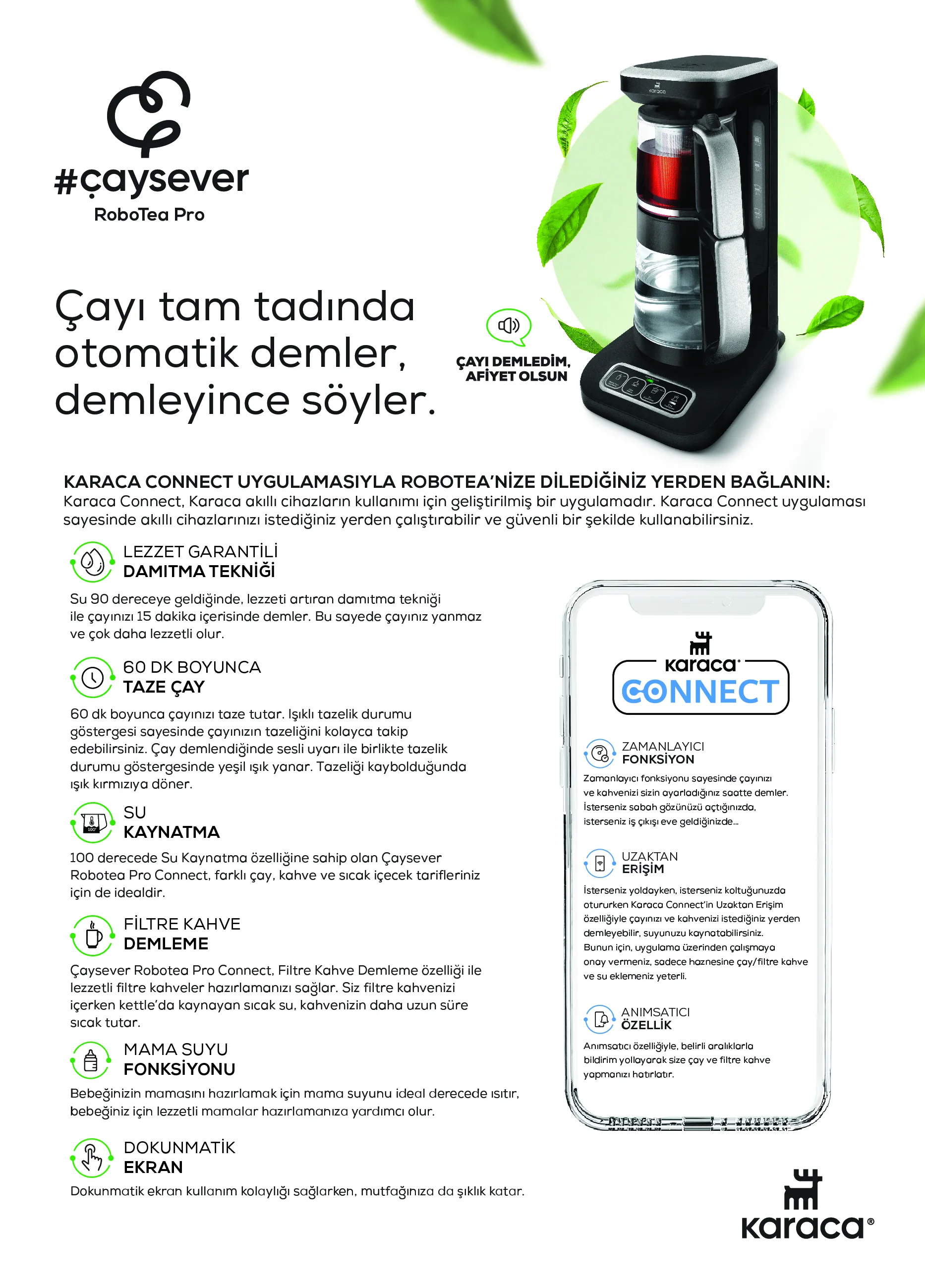 Anımsatıcı özelliği sayesinde de çay ve filtre kahve rutinlerinizi unutmazsınız. Çayınızı, lezzet garantili damıtma tekniğini kullanarak 15 dakikada demleyen Çaysever Robotea Pro Connect, çay yapraklarını yakmadan lezzeti tam tadında, çayın demlenmesini sağlar. 90 derecede ideal renge ve lezzete kavuşan çayınız 60 dakika boyunca taze kalır. Üstelik çayınızın tazeliğini de tazelik durumunu gösteren ışık göstergesiyle takip edebilirsiniz.