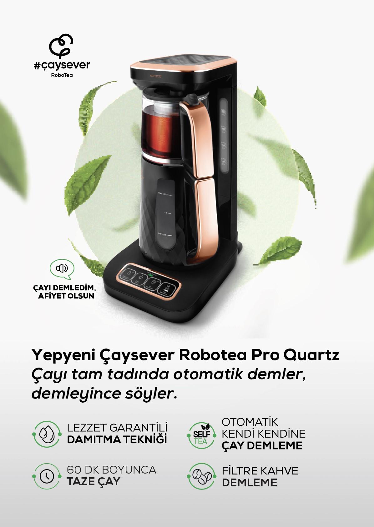 Çayınızı, lezzet garantili damıtma tekniğini kullanarak 15 dakikada demleyen Çaysever Robotea Pro, çay yapraklarını yakmadan lezzeti tam tadında, çayın demlenmesini sağlar. 90 derecede ideal renge ve lezzete kavuşan çayınız 60 dakika boyunca taze kalır. Üstelik çayınızın tazeliğini de tazelik durumunu gösteren ışık göstergesiyle takip edebilirsiniz.
