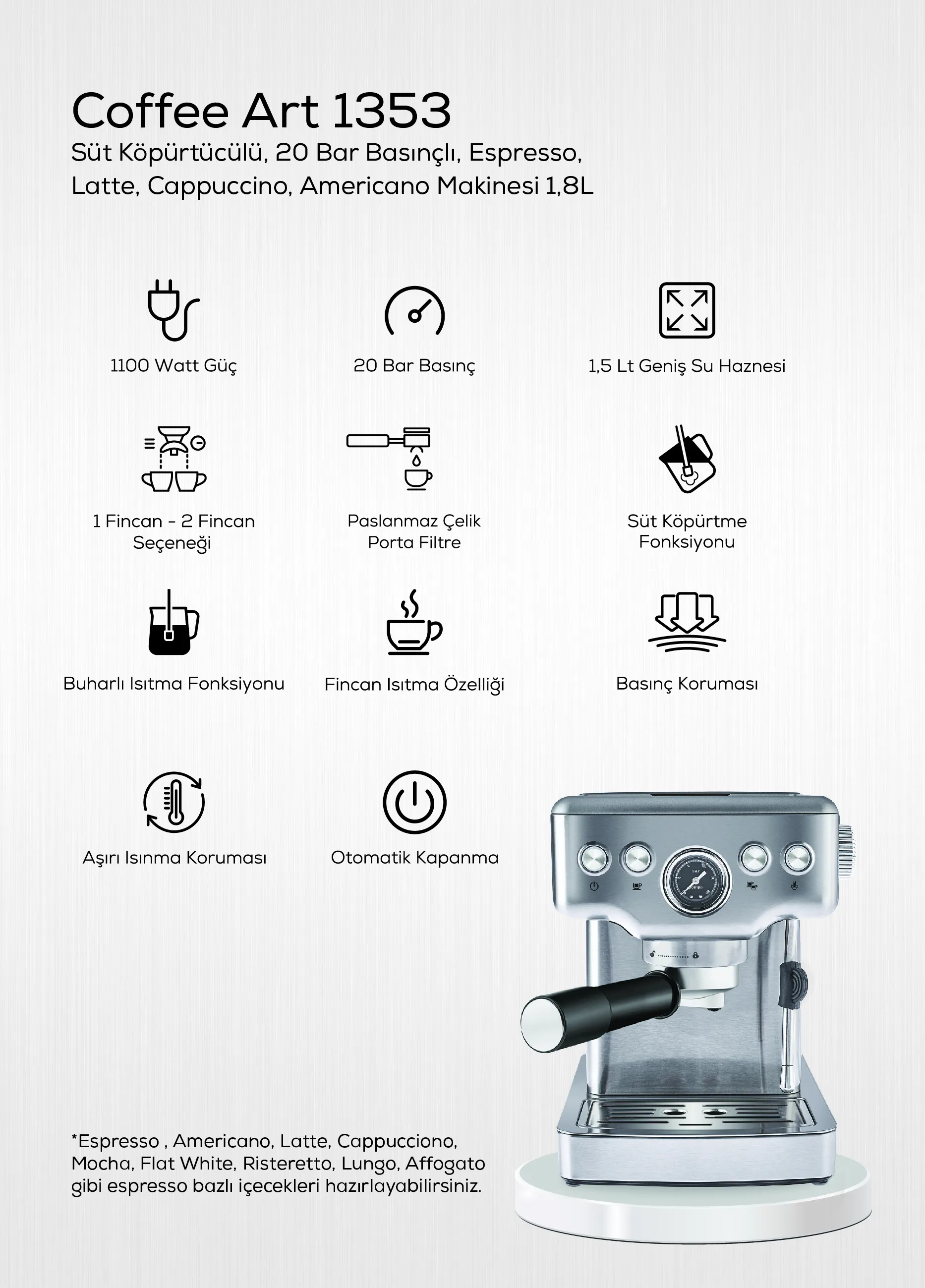 Coffee Art 1353 Espresso Makineniz, 1350 Watt güce sahiptir, bu sayede makineniz kahve hazırlamaya kısa sürede hazır olur.