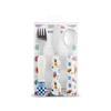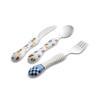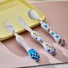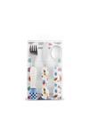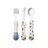 Set üç parçadan oluşuyor: çatal, kaşık ve bıçak — çocukların kendi başına yemek sürecini destekliyor.