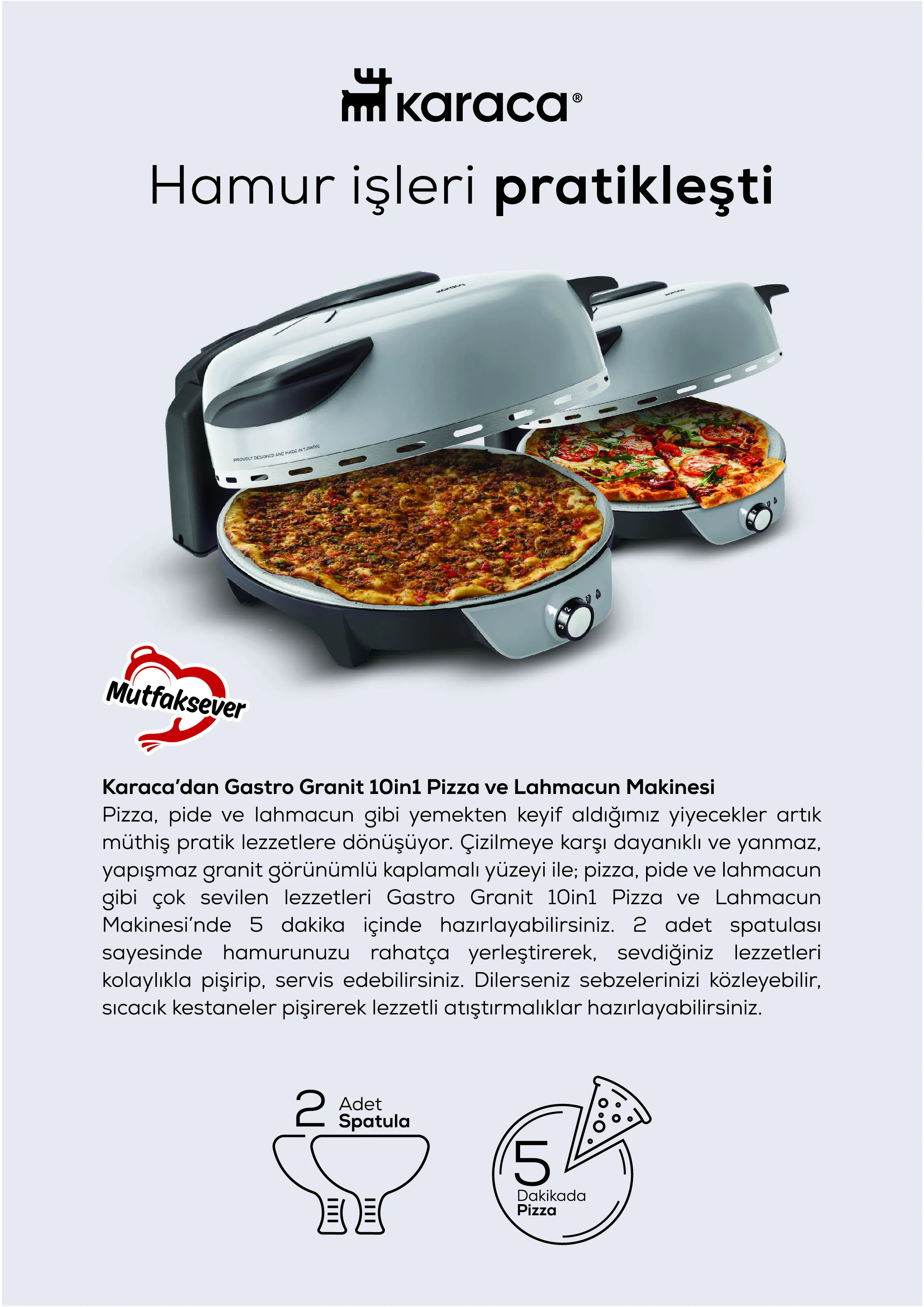 - Gastro 10in1 Pizza Makinesi, 1500 watt gücü sayesinde 400 derece sıcaklığa çıkarak sadece 5 dakikada hızlı ve taş fırın lezzetinde pizzalar yapmanızı sağlar.