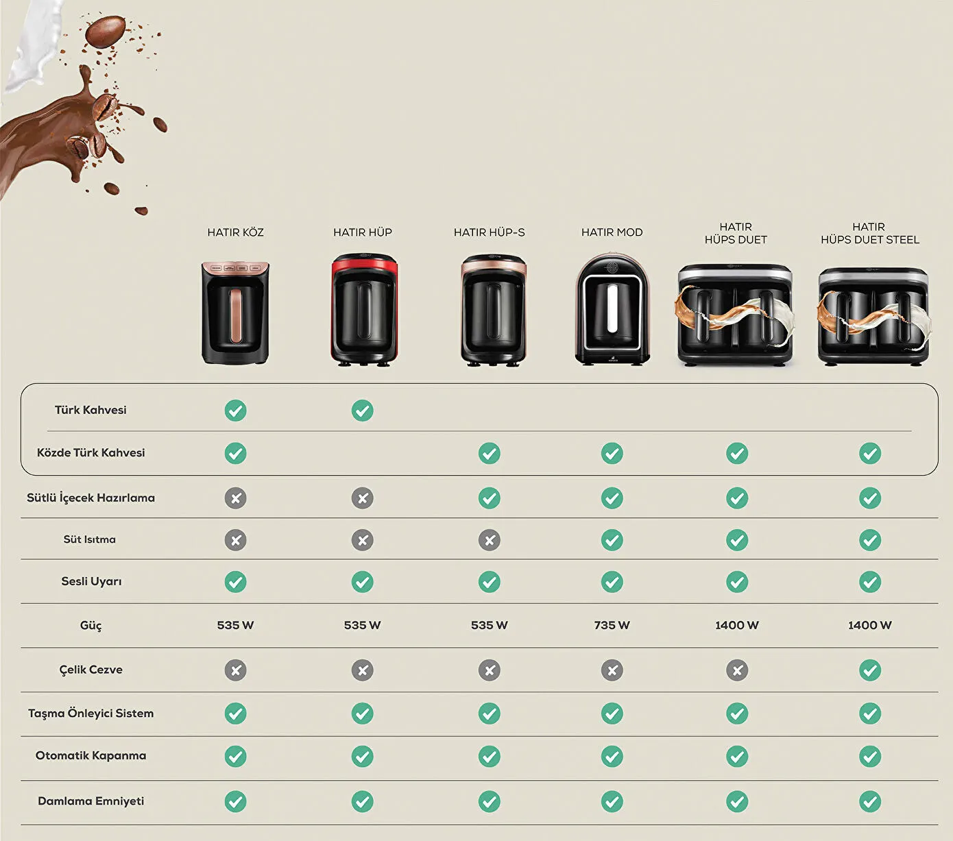 Türk kahvesi tutkunlarının vazgeçilmezi Hatır ailesinden, yepyeni Hatır Köz her fincanda köz tadında. Tek seferde ister 5 fincan Türk Kahvesi, isterseniz de Közde Türk Kahvesi yapabilen Hatır Köz, otomatik ısı ayarı ile kahveyi en doğru sıcaklıkta, ideal kıvamda ve tam zamanında pişirir. Özel ölçü kaşığı sayesinde bol köpüklü Türk Kahvesi için kahve miktarını kolaylıkla belirleyebilirsiniz. Taşma önleyici sistemiyle güvenli bir kullanım sunarken, sesli ve ışıklı uyarı sistemi sayesinde pişirme işlemi bittiğinde haber verir. Otomatik kapanma özelliği sayesinde pişirme işlemi bittikten sonra kendiliğinden kapanır. Geniş renk seçenekleri ile her zevke ve mutfağa da uyumlu!