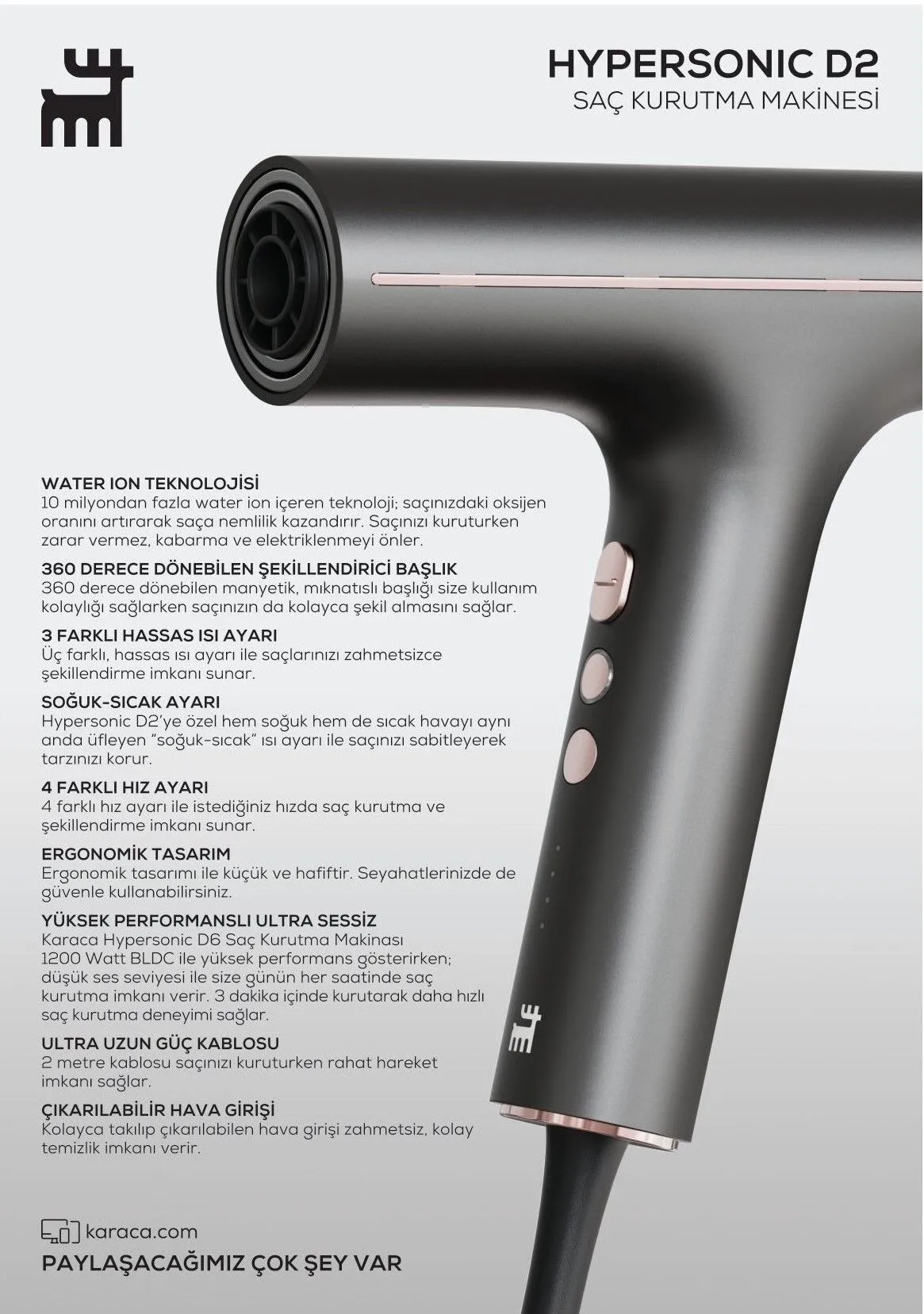 Karaca Hypersonic D2 Saç Kurutma Makinesi 1200 Watt BLDC ile yüksek performans gösterirken; düşük ses seviyesi ile size günün her saatinde saç kurutma imkanı verir. 3 dakika içinde kurutarak daha hızlı saç kurutma deneyimi sağlar.