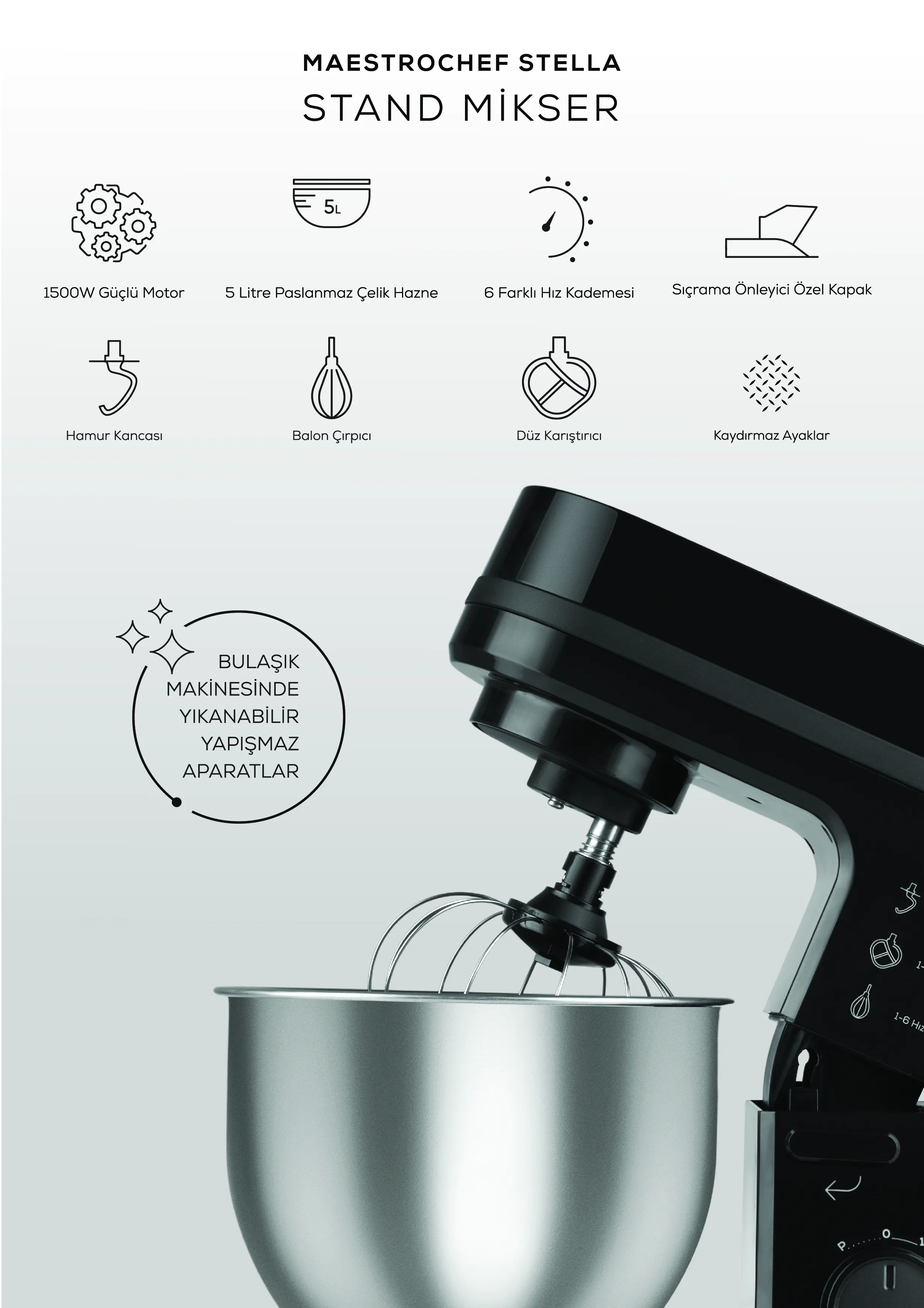 - 1500W gücündeki motoru sayesinde yoğun kıvamlı hamurlar bile zahmetsizce hazırlanır.