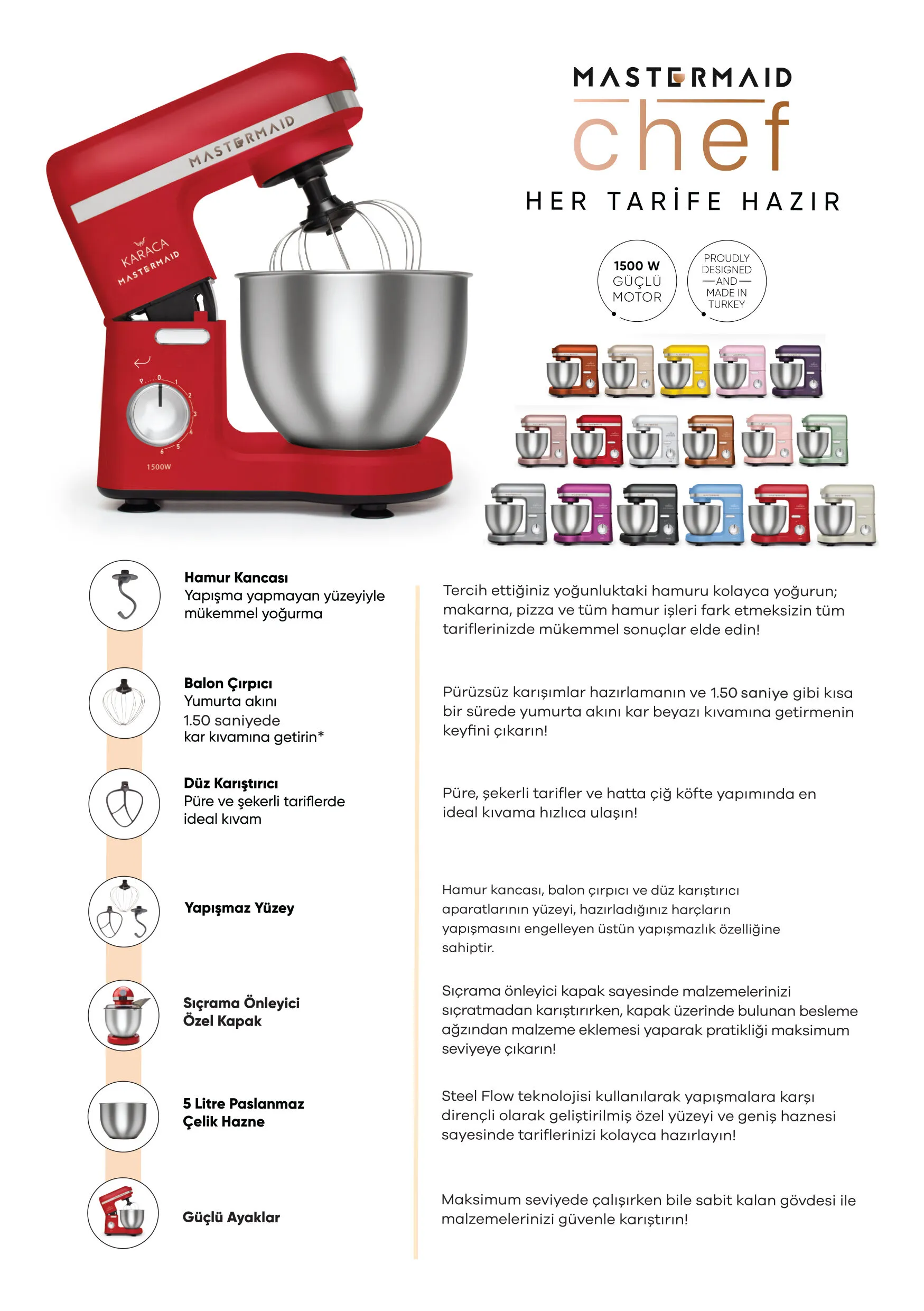 - 17 farklı zengin renk seçeneği ile Mastermaid Stand Mikser her renkte dekore edilmiş mutfağa uyum sağlar.