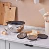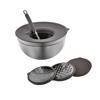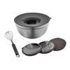 Paslanmaz çelikten üretilmiş çok amaçlı karıştırma ve saklama kabı bir ürün ile 3 ayrı özellik sunmaktadır; rendeler, karıştırır, saklar.