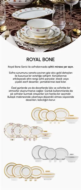 İncelikle tasarlanmış kenar detayları, zarif desenleri ve altın yaldız gibi asil dokunuşlarıyla dikkat çeken Royal Bone yemek takımları; hem günlük kullanımlarda sofistike bir atmosfer yaratmak hem de özel davet sofralarında büyüleyici bir etki bırakmak için idealdir.