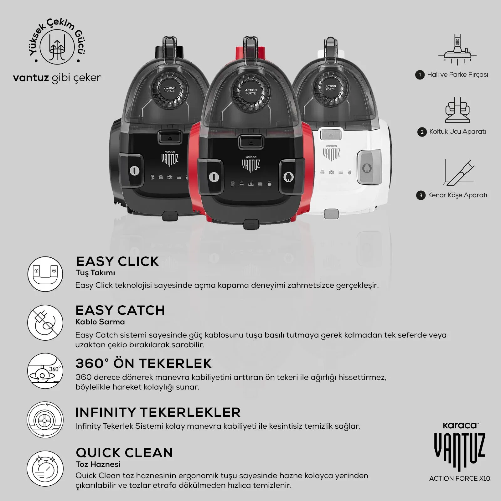 - Infinity Tekerlek Sistemi kolay manevra kabiliyeti sayesinde kesintisiz ve kolay temizlik sağlar.