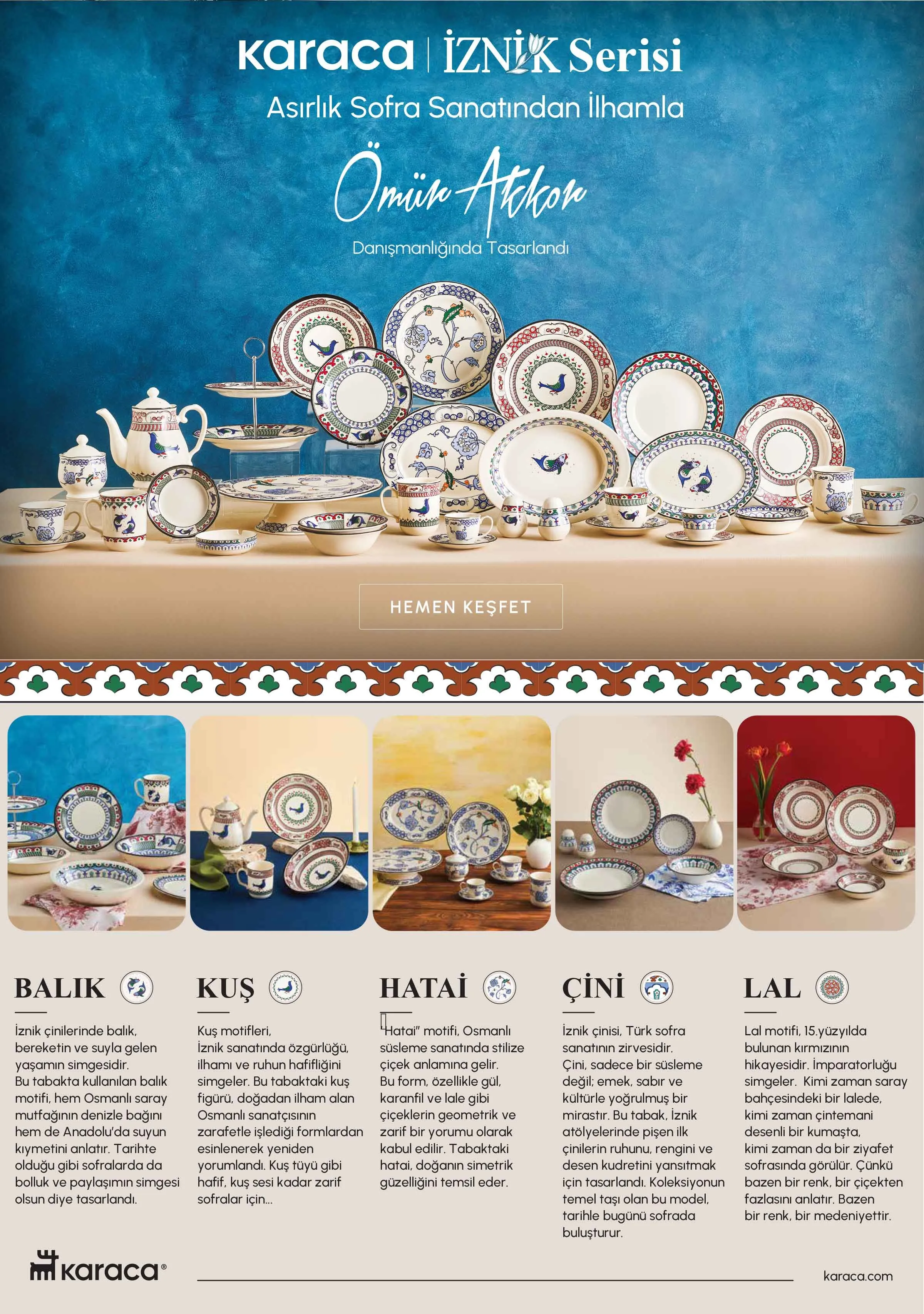 Asırlık desenler, modern sofralarla buluşuyor! Karaca’nın ünlü şef Ömür Akkor ile birlikte hazırladığı İznik Serisi, Anadolu’nun köklü kültür mirasını sofralara taşıyor. İlhamını 15. yüzyıl İznik çinilerinden alan bu eşsiz koleksiyon, geçmişin zarafetini günümüzün