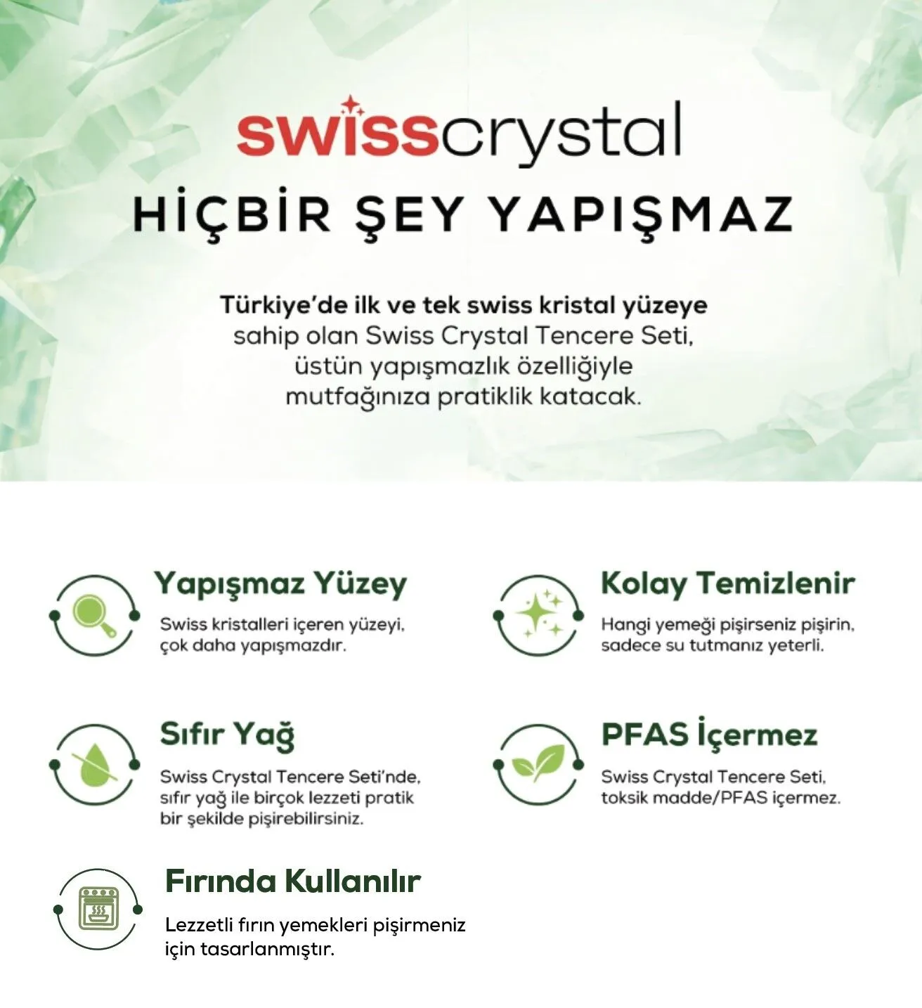 - Sıfır Yağ: SwissCrystal Tencere Seti’nin üstün yapışmaz yüzeyi sayesinde sıfır yağda bile; pankek, pilav, yumurta, balık ve tavuk gibi birçok lezzeti yapışmadan, pratik bir şekilde pişirebilirsiniz.