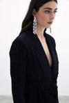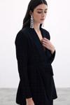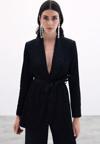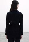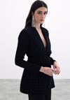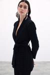 Yakalı kruvaze yaka, düz uzun kol, uzun boy, iç astarlı, kare desenli kuşaklı ceket.