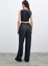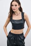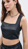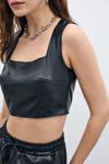 Kare yaka, iç astarlı, arka fermuarlı, deri crop bluz.