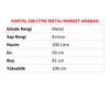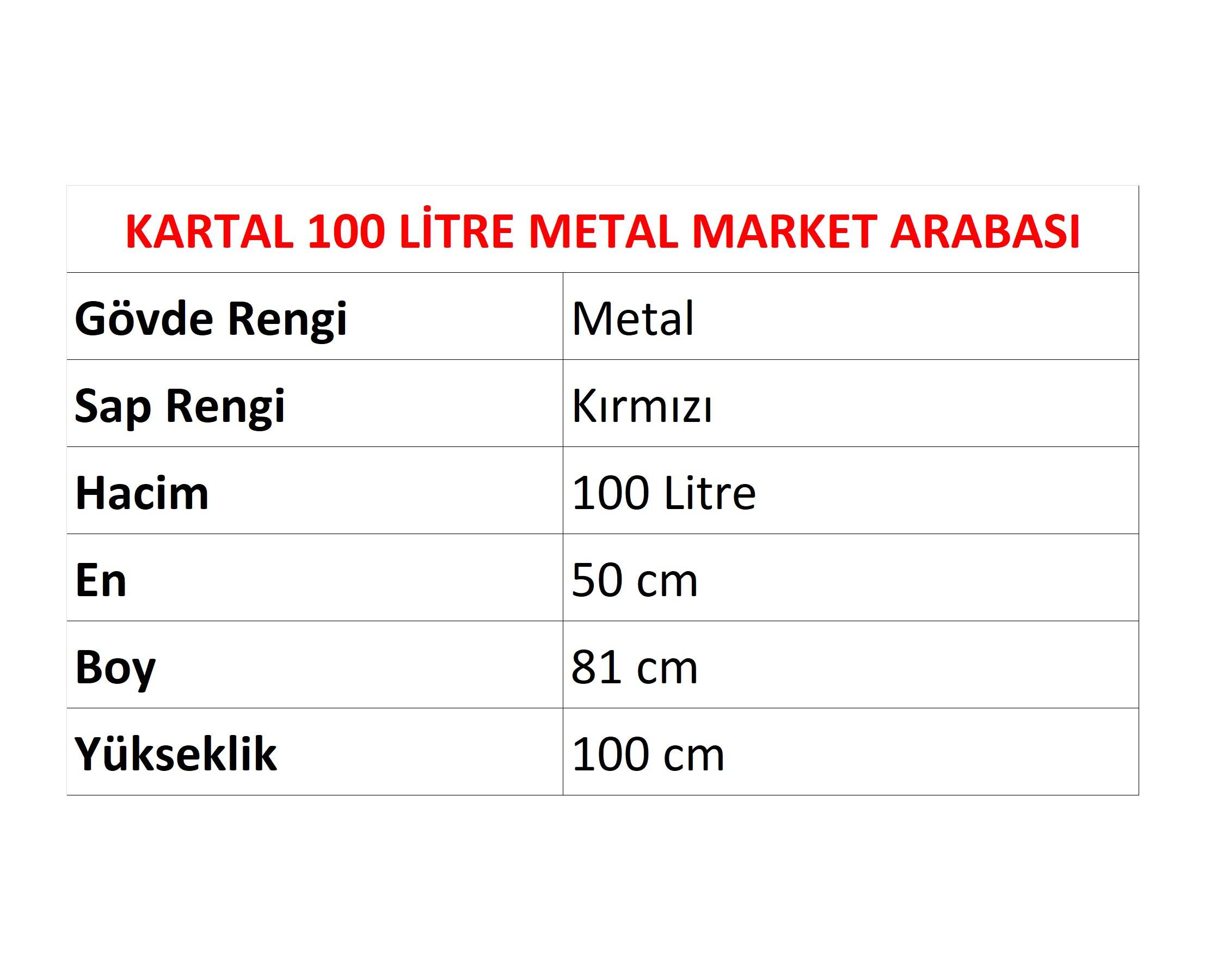 Kartal 100 Litre Metal Market Arabasının özellikleri ve açıklamaları aşağıda verilmiştir. Farklı ölçü seçenekleri ve daha fazla bilgi için mağazamızı ziyaret edebilirsiniz.