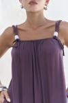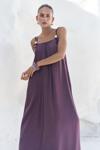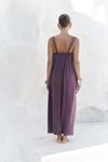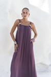 Örgü askılı, boncuk detaylı, geniş kesim ve parlak görünümlü kumaştan uzun boy elbise. Astarsız.