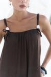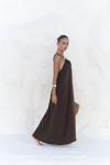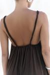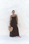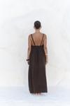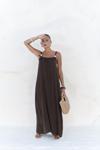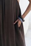 Örgü askılı, boncuk detaylı, geniş kesim ve parlak görünümlü kumaştan uzun boy elbise. Astarsız.