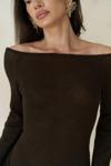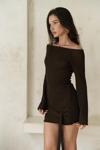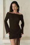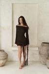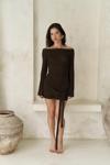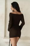 Kayık yaka, uzun evaze kollu. Etek ucu bağlama detaylı, astarsız. Pamuk karışımlı triko elbise.