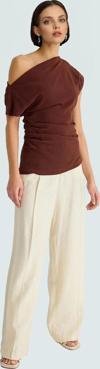 Bu ekru renkli bluz, şıklığı ve rahatlığı bir araya getiren benzersiz tasarımıyla dikkat çekiyor. Kayık yakası ve tek kollu kesimiyle modern bir görünüm sunarken, krep dokuma kumaşıyla da gün boyu konfor sağlar. Fitted kalıbıyla vücudunuza mükemmel oturur ve her türlü kombinle uyum sağlar. Yaz akşamları için ideal bir seçim olan bu bluz, gece dışarı çıkarken ya da şık bir davette göz alıcı görünmenizi sağlar. Nefes alabilen yapısı ve kolay bakımıyla da pratik kullanım sunar.