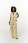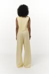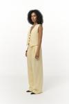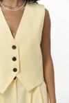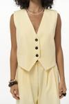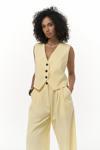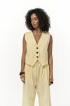 V yaka, kolsuz ve kısa yelek, biyeli yalancı ön cep, önden düğmeli.