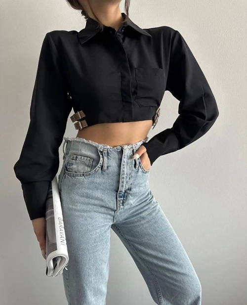 Kazax Yanı kemer detaylı crop gömlek siyah s4009