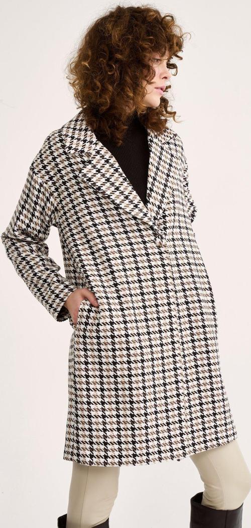 Tek düğmeli kapama, uzun kol, astarlı, cepli, kazayağı desenli kaban.