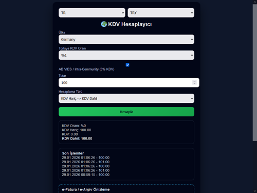 Bu araç, maliyet ve fiyatlandırma planlamasını kolaylaştırarak hızlı KDV hesaplaması ihtiyacını en yalın haliyle karşılar; temel e-fatura süreçlerine uygun şekilde entegre edilebilir.