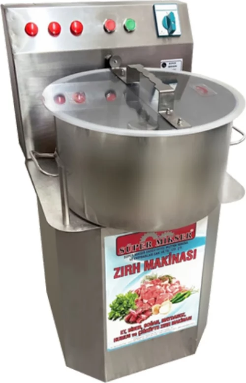 Süpermikser Kebaplık Et Çekme ve Zırh Makinesi genellikle profesyonel mutfaklarda, et restoranlarında, kasaplarda ve büyük gıda üretim tesislerinde kullanılır. Et ve baharatların kebap kıyması haline getirmek haline getirme işlemi için kullanılır. Humus yapmak içinde kullanılmaktadır. Bıçakları ikili veya üçlü olarak yapılabilir. 60 kg ağırlığında olup 1,5 KW motor gücüne sahiptir. Saatte 200 kg doğrama, 170 kg ezme ve 250 kg karıştırma yapma kapasitesine sahiptir. Haznesi 20 litre kapasitelidir. Komple paslanmaz çelikten üretilmiştir. Süpermikser Makinelerinin yaygın servis ve yedek parça ağı ile satış sonrası da en hızlı, en ucuz ve en güvenli çözüm hizmetlerinden yararlanabilirsiniz. Ürünlerimiz adınıza faturalı olup 1 yıl garantilidir. Ürünlerimizin tamamı CE belgelidir. Profesyonel işletmeler için uygundur.