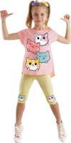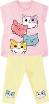 2 parça kız çocuk takım. Pamuklu penye kumaştan, pembe t-shirt. Üzeri kedi baskılı. Pamuklu, elastik tayt. Dizleri kedi baskılı. Tüm Denokids ürünleri çocuk güvenlik kurallarına uygun olarak üretilmekte ve iğne dedektörlerinden geçmektedir.