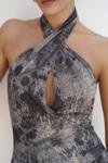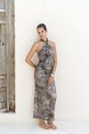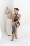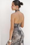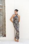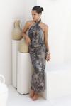 Ense düğme detaylı. Derin V yaka uzun elbise. Vücuda oturan formda, desenli ve hafif esnek kumaştan tasarlanmıştır. Astarlı.