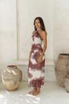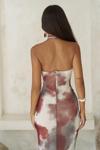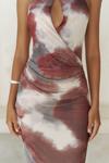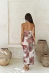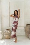 Ense düğme detaylı. Derin V yaka uzun elbise. Vücuda oturan formda, desenli ve hafif esnek kumaştan tasarlanmıştır. Astarlı.