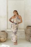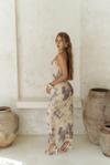 Ense düğme detaylı. Derin V yaka uzun elbise. Vücuda oturan formda, desenli ve hafif esnek kumaştan tasarlanmıştır. Astarlı.