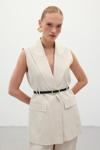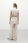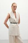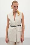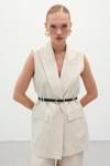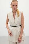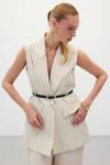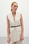 Bu yelek, keten kumaşın doğal dokusuyla rahatlık sunarken, kemer detayıyla stilinizi tamamlıyor.